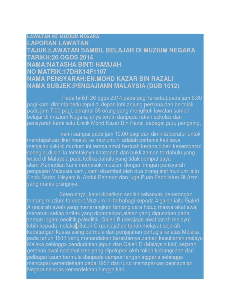 Related : Laporan Lawatan Sambil Belajar Ke Muzium Negara / Pada cu pada cuti ti pe pengg nggal al ked kedua ua ya yang ng la m ni ad adala alah h pe pert rtama ama ka kalili say saya a menjejak menj ejak kaki di muzi muzium um ini, saya tera terasa sa amat bertuah bertuah..