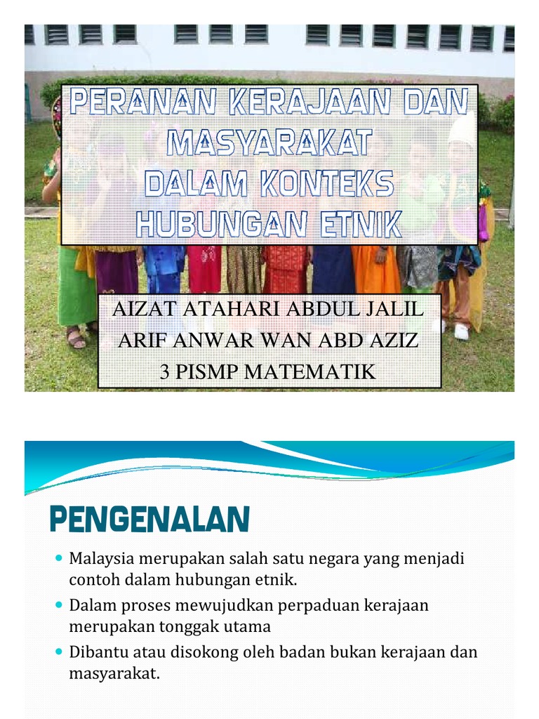 CABARAN DAN PEMUPUKAN HUBUNGAN ETNIK DI MALAYSIA PDF from image.slidesharecdn.com Hubungan etnik di malaysia disediakan oleh: Sign up log in remake share arrow_back zoom_in download open_in_new add comment bab 7: Ny bin musa, n bin muslim, ah buang. Bab ini akan menjelaskan beberapa konsep penting yang mempunyai kaitan rapat dalam membicarakan aspek hubungan etnik di malaysia. Kepentingan australia dalam pencarian pesawat malaysia airlines mh370 di samudra hindia selatan. Latar belakang 1.1 pengenalan peristiwa 13 mei 1969 merupakan satu titik hitam yang telah mencacat keamanan dan keharmonian rak… Oleh hal demikian, soal perpaduan dan hubungan di antara kaum merupakan agenda penting negara dalam memastikan kestabilan politik sentiasa terjamin. Dalam hal ini, setiap polisi dan projek yang dijalankan mesti objektif terakhirnya adalah untuk perpaduan kaum.
